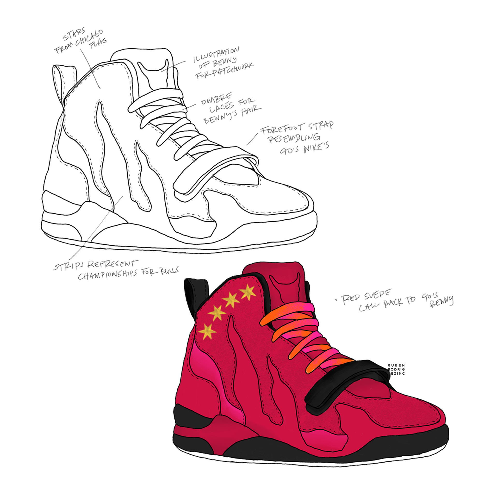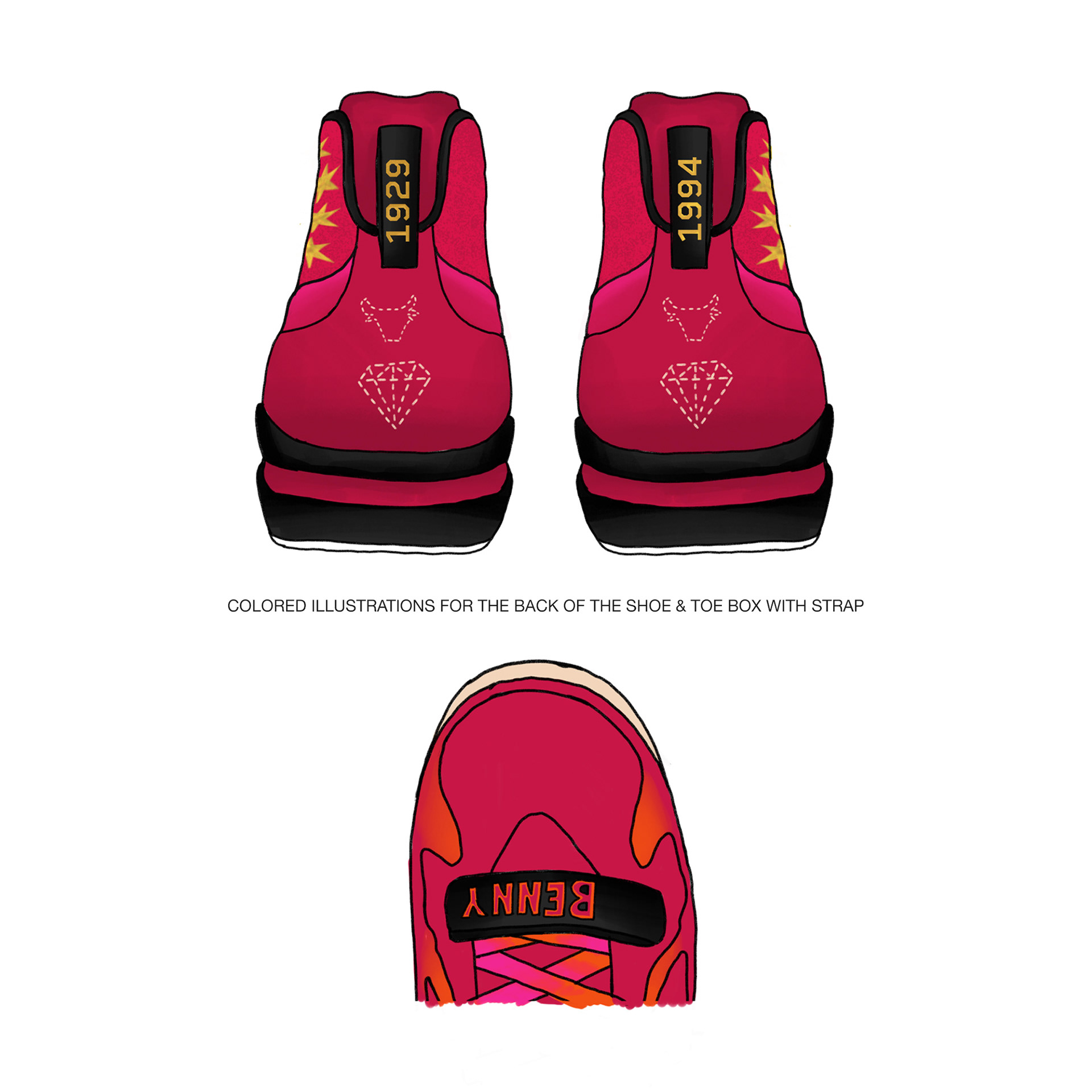 In collaboration with my creative friend, Emma McKee aka StitchGawd, presented me with an extraordinary opportunity to collaborate with her on the creation of custom footwear for the iconic Chicago Bulls mascot, Benny The Bull. My role encompassed the design of the shoe’s silhouette from the ground up, as well as the incorporation of distinctive elements that would be sewn onto the footwear for Benny’s use during games. These custom-designed shoes were crafted to harmonize seamlessly with the Chicago Bulls City Edition jerseys, which commemorate the rich history of the original Chicago Stadium. The design incorporates elements that evoke the spirit of the first three Bulls Championships, represented by the three distinctive horns on the sides of the shoe. The all-encompassing red suede pays homage to the iconic red shoes worn by Benny during the 1990s. The four gold stars symbolize the stars emblazoned upon the Chicago Flag, while the ombre/gradient pink and orange laces capture the essence of Benny’s distinctive hairstyle. A captivating illustration of Benny’s face adorns the tongue of each shoe, while the back tabs proudly display the annals of Chicago Stadium’s existence, spanning from 1929 to 1994.
